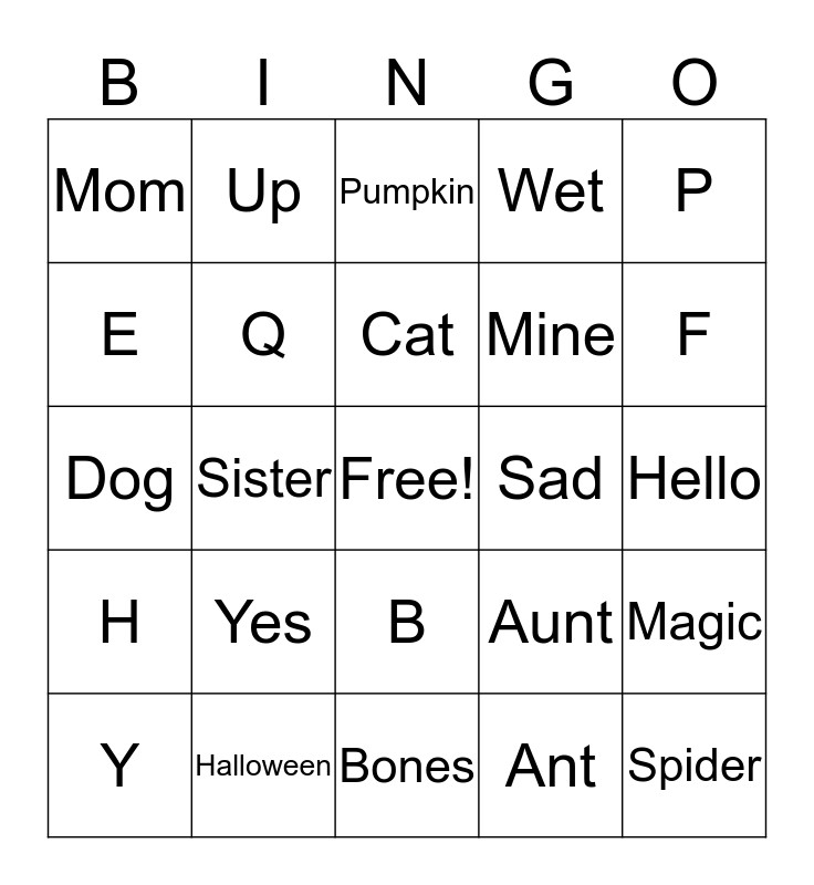 This bingo card has a free space and 71 words: Inside, Up, V, Happy, Bones, Bird, Wet, M, Mine, J, Y, Grandpa, F, Mom, A, Dog, Aunt, P, Frog, Hello, Yes, Spider, Magic, O, Dry, Yours, Grandma, Down, Outside, Dad, Halloween, Uncle, Pony, Monkey, Ant, Cousin, L, N, E, C, B, Z, H, I, K, N, You, Q, R, S, T, U, Sad, W, X, Ghost, Cat, Family, Friends, Me, Fish, No, Sister, Bro, Costume, Autumn, Pumpkin, Horse, Bat, Candy and Holiday.