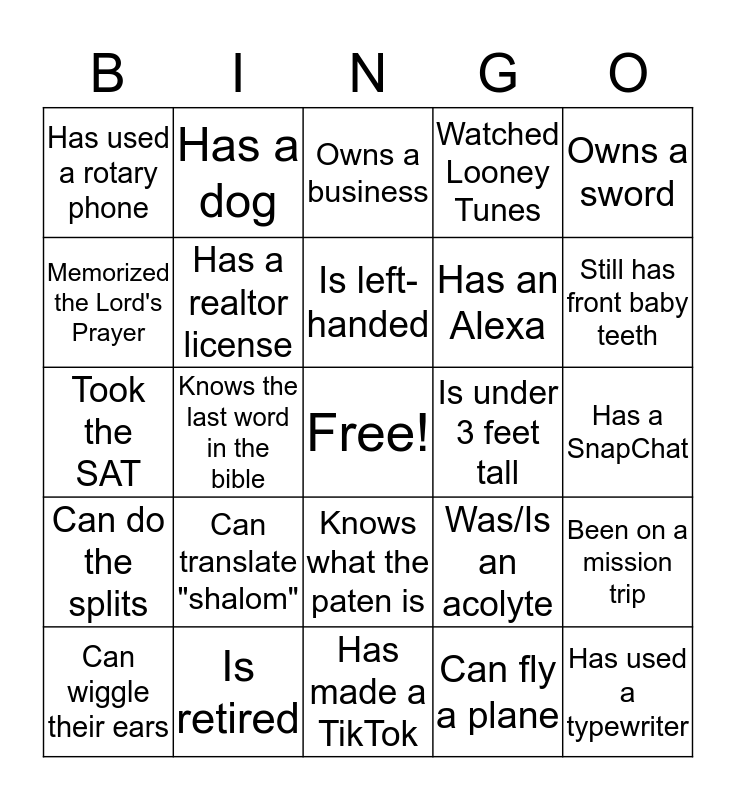 This bingo card has a free space and 34 words: Has grandkids, Can fly a plane, Lived on another continent, Can do a cartwheel, Can do the splits, Has a realtor license, Owns a sword, Can wiggle their ears, Has a dog, Has a cat, Is left-handed, Owns a business, Has driven a motorcycle, Knows what SOH CAH TOA means, Is under 3 feet tall, Still has front baby teeth, Is retired, Took the SAT, Can translate "shalom", Was/Is an acolyte, Knows what the paten is, Climbed a 14ner, Has used a rotary phone, Has a SnapChat, Has made a TikTok, Has used a typewriter, Watched Looney Tunes, Had a black and white TV, Has an Alexa, Memorized the Lord's Prayer, Has prayed to the Holy Ghost, Knows the last word in the bible, Been on a mission trip and Been on a pilgrimage.