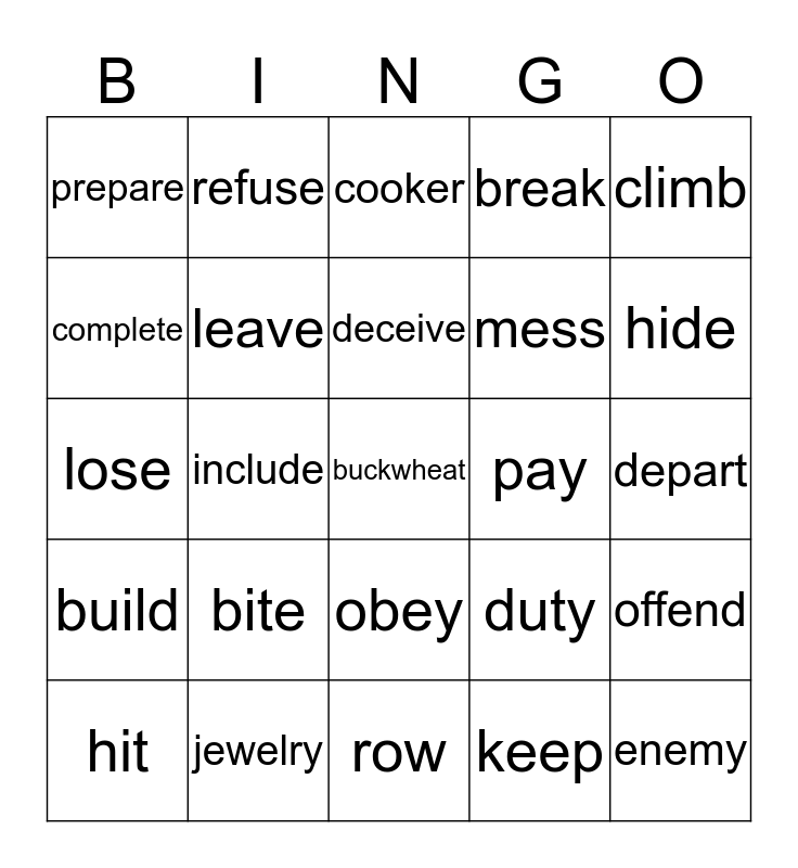 This bingo card has 64 words: Free!, behave, receive, offend, scold, praise, refuse, annoy, deceive, follow, obey, arrive, depart, climb, enter, complete, include, prepare, tidy, mess, bite, build, break, buy, bring, catch, cut, dig, drink, drive, fall, forget, fight, fly, hide, hit, grow, keep, lay, leave, lose, pay, put, ride, shut, buckwheat, jewelry, enemy, duty, impression, suggestion, relative, row, quarrel, day off, garage, cooker, pillow, towell, vacuuum cleaner, iron, niece, nephew and pick up.