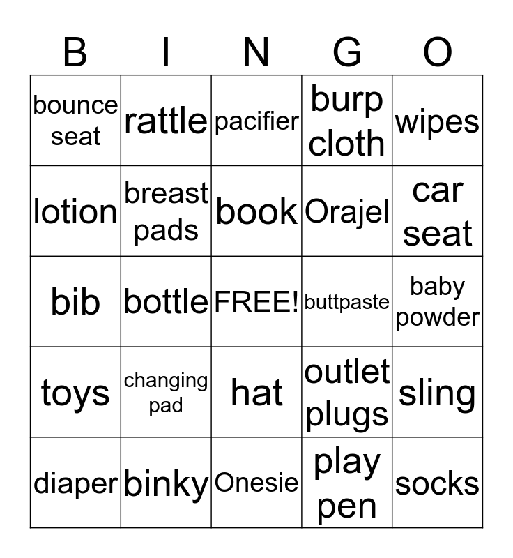 This bingo card has a free space and 24 words: changing pad, binky, book, diaper, wipes, bounce seat, lotion, rattle, buttpaste, hat, Orajel, bib, outlet plugs, sling, breast pads, play pen, baby powder, pacifier, car seat, bottle, socks, toys, burp cloth and Onesie.
