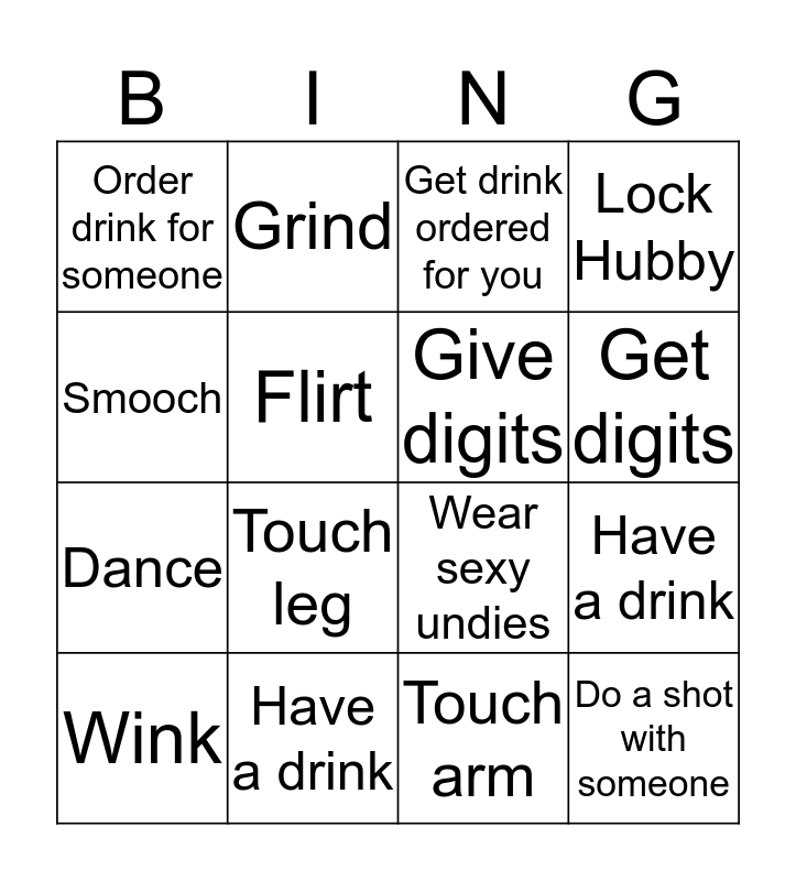 This bingo card has 16 words: Have a drink, Have a drink, Get drink ordered for you, Order drink for someone, Dance, Grind, Wear sexy undies, Touch arm, Smooch, Flirt, Wink, Lock Hubby, Touch leg, Get digits, Give digits and Do a shot with someone.