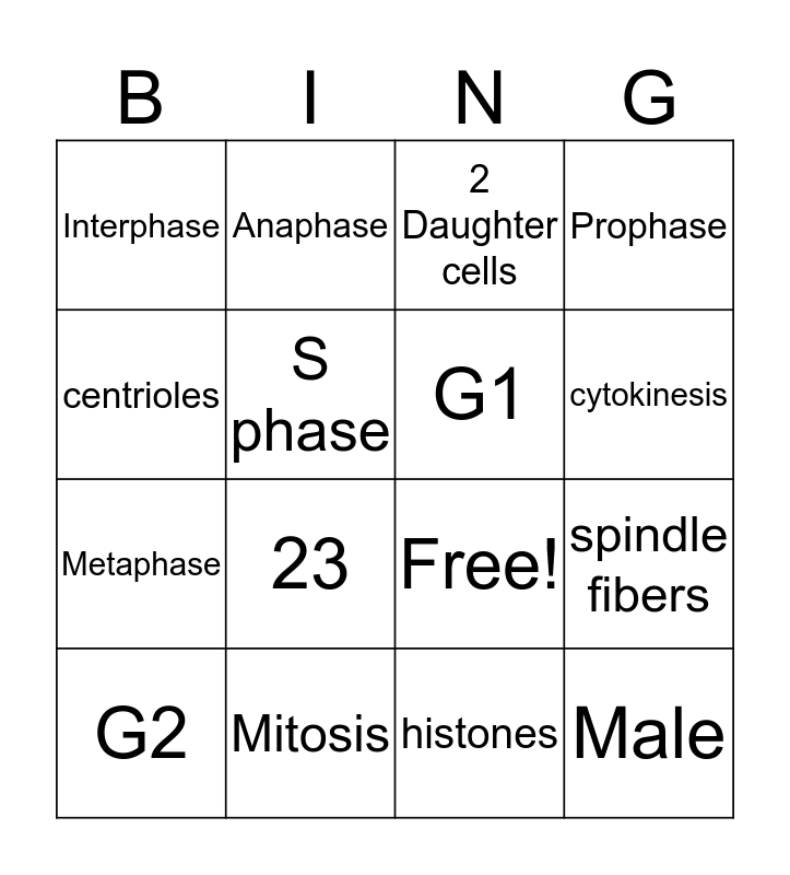 This bingo card has 21 words: Mitosis, chromosomes, Anaphase, 46, histones, G1, Interphase, 2 Daughter cells, Free!, cytokinesis, Metaphase, Prophase, Male, Female, S phase, Telophase, G2, 23, centrioles, spindle fibers and chromatid.