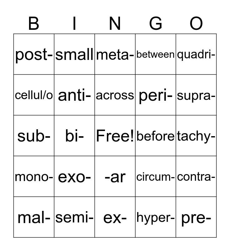 This bingo card has a free space and 24 words: exo-, semi-, across, mal-, quadri-, post-, cellul/o, small, before, -ar, peri-, sub-, circum-, contra-, anti-, hyper-, tachy-, meta-, supra-, bi-, pre-, mono-, between and ex-.