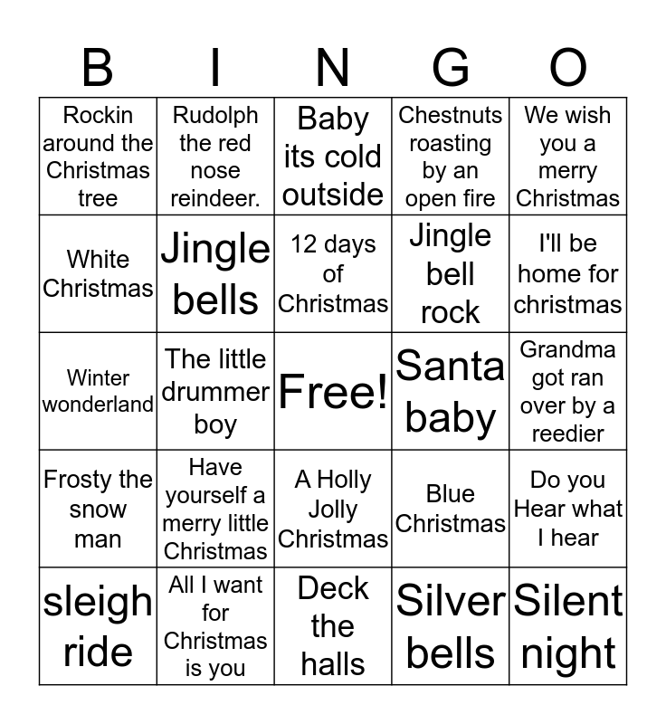 This bingo card has a free space and 24 words: Have yourself a merry little Christmas, All I want for Christmas is you, 12 days of Christmas, sleigh ride, We wish you a merry Christmas, Rockin around the Christmas tree, White Christmas, Rudolph the red nose reindeer., Santa baby, A Holly Jolly Christmas, Jingle bell rock, Winter wonderland, Blue Christmas, Do you Hear what I hear, Jingle bells, Silver bells, Grandma got ran over by a reedier, Baby its cold outside, I'll be home for christmas, The little drummer boy, Silent night, Frosty the snow man, Chestnuts roasting by an open fire and Deck the halls.