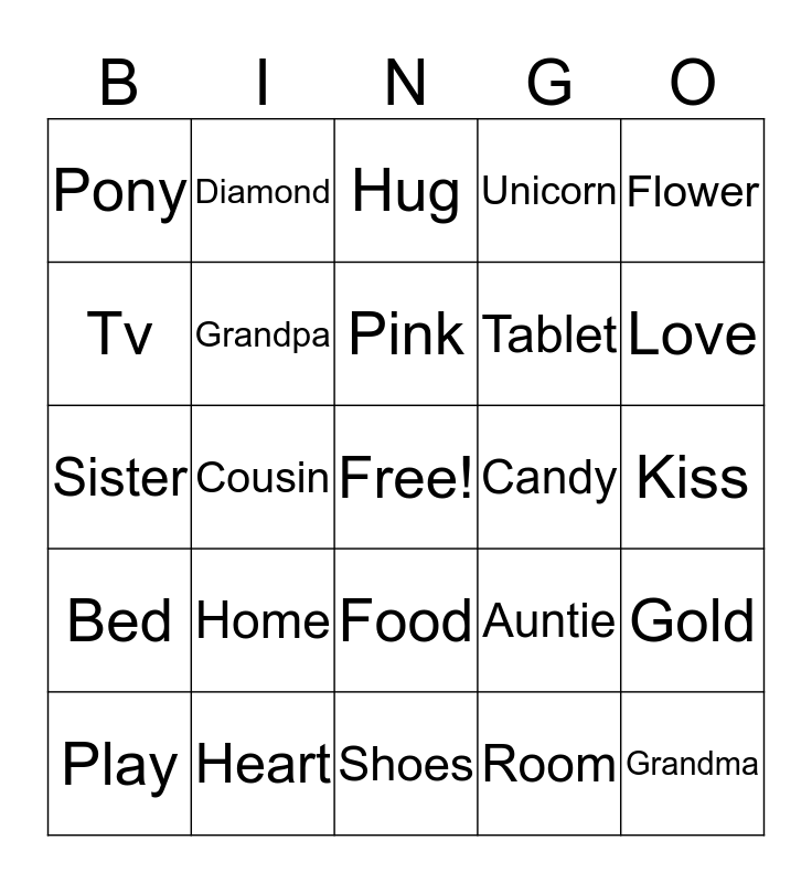 This bingo card has a free space and 29 words: Play, Eat, Cousin, Rainbow, Pony, Hug, Grandpa, Home, Candy, Heart, Kiss, Grandma, Shoes, Room, Love, Uncle, Food, Bed, Flower, Sister, Auntie, School, Tablet, Tv, Unicorn, Diamond, Gold, Pink and Blue.