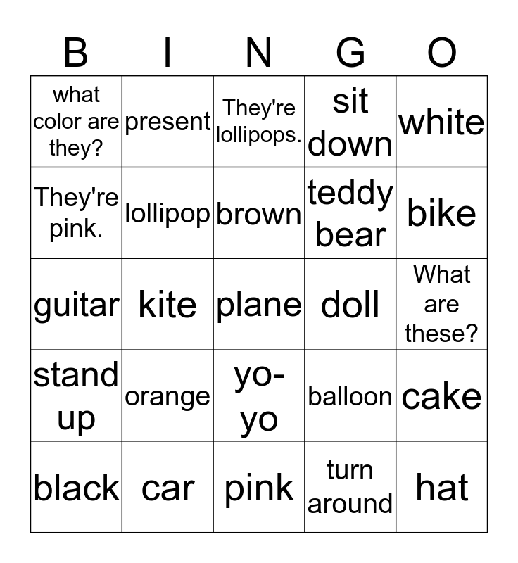 This bingo card has 25 words: orange, pink, brown, black, white, what color are they?, They're pink., present, doll, yo-yo, teddy bear, guitar, balloon, cake, lollipop, hat, What are these?, They're lollipops., bike, kite, plane, car, stand up, sit down and turn around.
