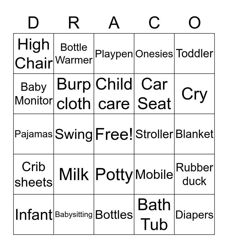This bingo card has a free space and 39 words: Baby, Mom, Dad, Burp cloth, Infant, Potty, Child care, Bibs, Toddler, Crib sheets, Swing, Onesies, Diapers, Blanket, Stroller, Milk, Pacifier, High Chair, Nursery, Mobile, Baby Monitor, Bottles, Car Seat, Cry, Diaper Pail, Changing pad, Baby Wipes, Rash cream, Breast pump, Bottle Warmer, Small Bowls, Sippy Cups, Playpen, Babysitting, Bath Tub, Hooded Towels, Rubber duck, Pajamas and Mittens.