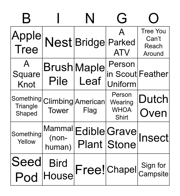 This bingo card has 31 words: Free!, Fire Ring, Climbing Tower, Pinecone, Apple Tree, Bridge, Brush Pile, Grave Stone, Person Wearing WHOA Shirt, Chapel, Dutch Oven, American Flag, Sign for Campsite, Animal Print, Feather, Boat, Insect, Mammal (non-human), Something Yellow, Edible Plant, Tree You Can’t Reach Around, Spider Web, Seed Pod, Nest, Person in Scout Uniform, A Square Knot, A Parked ATV, Something Triangle Shaped, Bird House, Maple Leaf and Oak Leaf.
