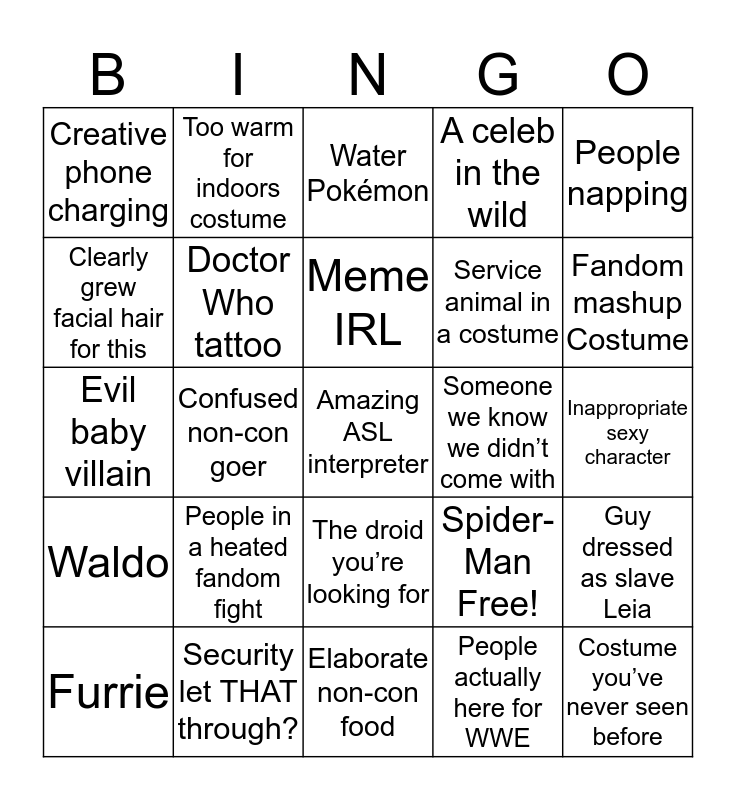 This bingo card has 25 words: People in a heated fandom fight, Elaborate non-con food, Meme IRL, Furrie, People napping, Creative phone charging, Clearly grew facial hair for this, Too warm for indoors costume, Someone we know we didn’t come with, The droid you’re looking for, Service animal in a costume, Evil baby villain, Spider-Man Free!, Guy dressed as slave Leia, Doctor Who tattoo, Costume you’ve never seen before, Inappropriate sexy character, Water Pokémon, Fandom mashup Costume, Confused non-con goer, Amazing ASL interpreter, Security let THAT through?, Waldo, A celeb in the wild and People actually here for WWE.