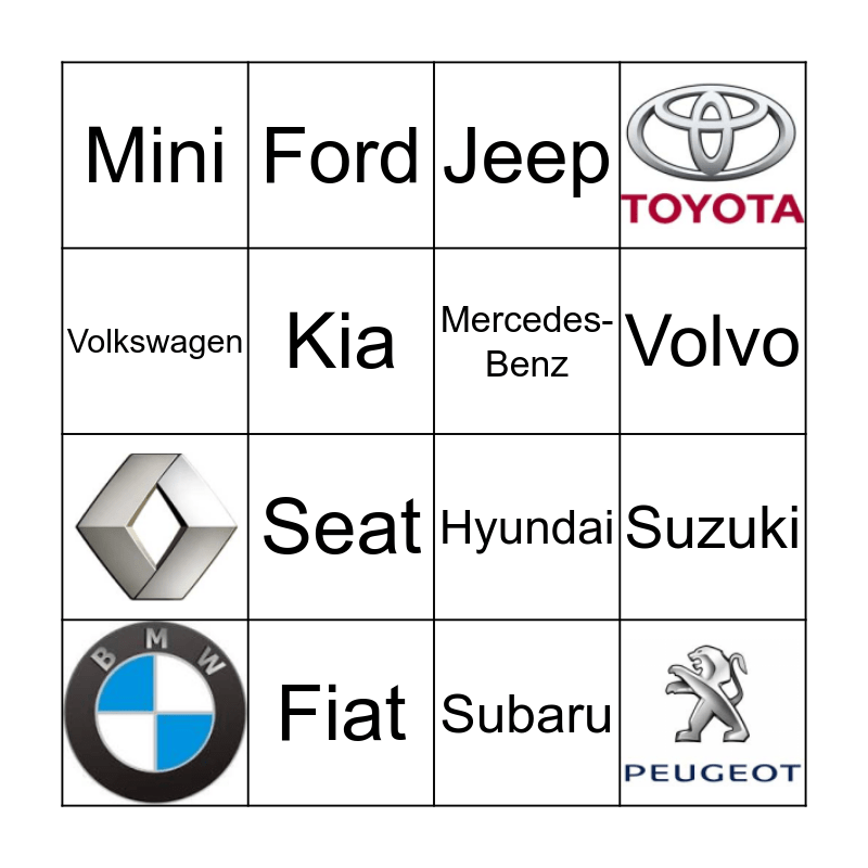 This bingo card has 4 images and 12 words: Fiat, Jeep, Volkswagen, Ford, Hyundai, Suzuki, Mini, Kia, Subaru, Volvo, Seat and Mercedes-Benz.