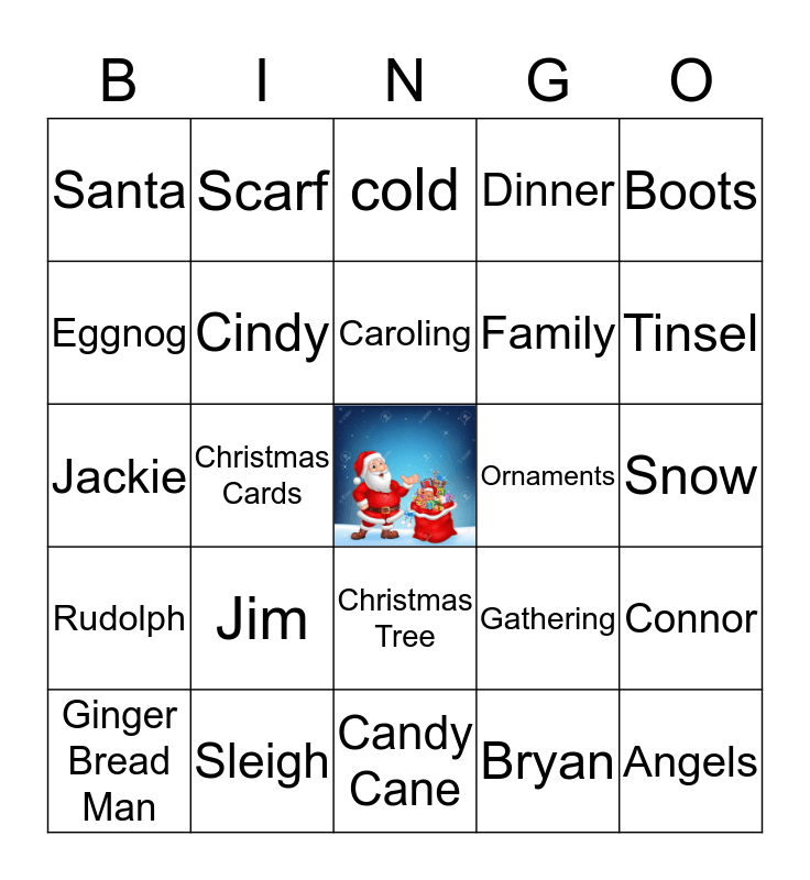 This bingo card has a free space and 54 words: Christmas, Rudolph, Star, Christmas Lights, Christmas Tree, Stockings, Dinner, Nativity, Eggnog, Snowman, Santa, Snowflake, Sleigh, Ginger Bread Man, Gifts, Candy Cane, Angels, Family, Cookies, Snow, Gathering, Mistletoe, Ornaments, Boots, Hat and Gloves, Scarf, Elves, David, Matt, Bryan, Carol, Meghan, Joey, Nicole, cold, Barb, Jackie, Connor, Cyndee, Cindy, Drinks, Train, Candle, Fireplace, Jim, Betty, Karen, Lisa, Caroling, Christmas Cards, Tinsel, Wine, Wrapping paper and Baking Cookies.