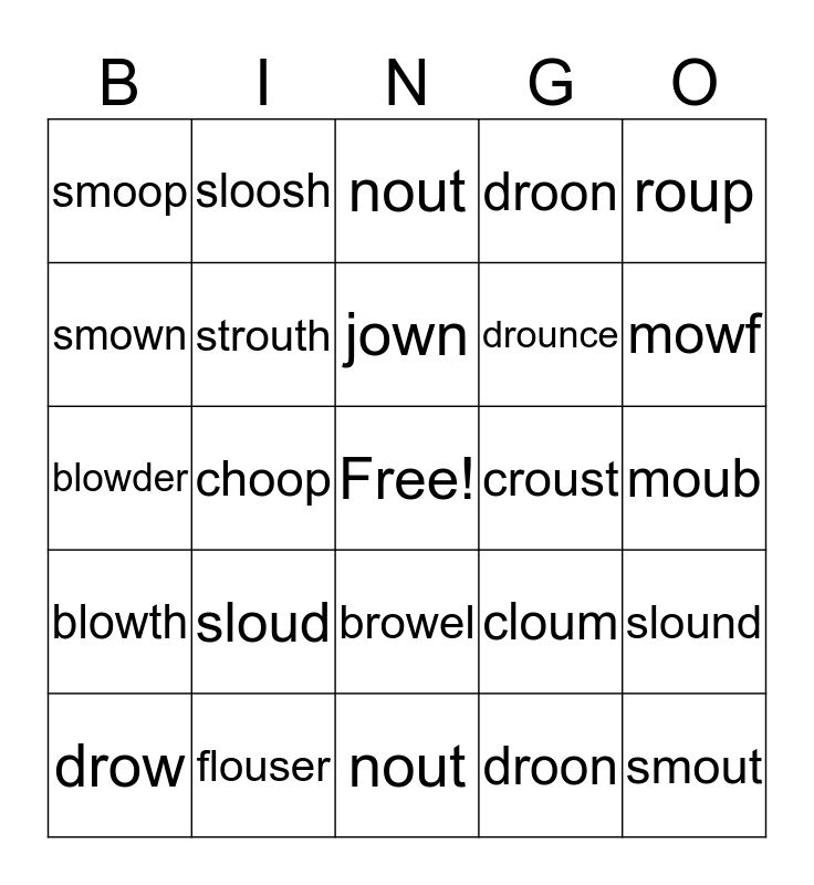 This bingo card has a free space and 24 words: sloud, flouser, jown, drow, roup, smoop, smown, sloosh, croust, browel, drounce, blowder, cloum, slound, strouth, droon, moub, nout, mowf, choop, smout, blowth, droon and nout.