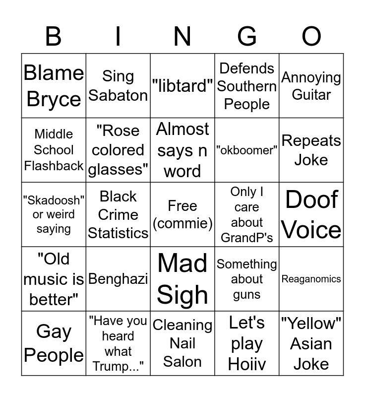 This bingo card has a free space and 24 words: Benghazi, "Have you heard what Trump...", Almost says n word, Gay People, Annoying Guitar, Blame Bryce, Middle School Flashback, Sing Sabaton, Only I care about GrandP's, Mad Sigh, "okboomer", "Skadoosh" or weird saying, Something about guns, Reaganomics, "Rose colored glasses", Let's play Hoiiv, Doof Voice, "libtard", Repeats Joke, Black Crime Statistics, "Yellow" Asian Joke, "Old music is better", Defends Southern People and Cleaning Nail Salon.