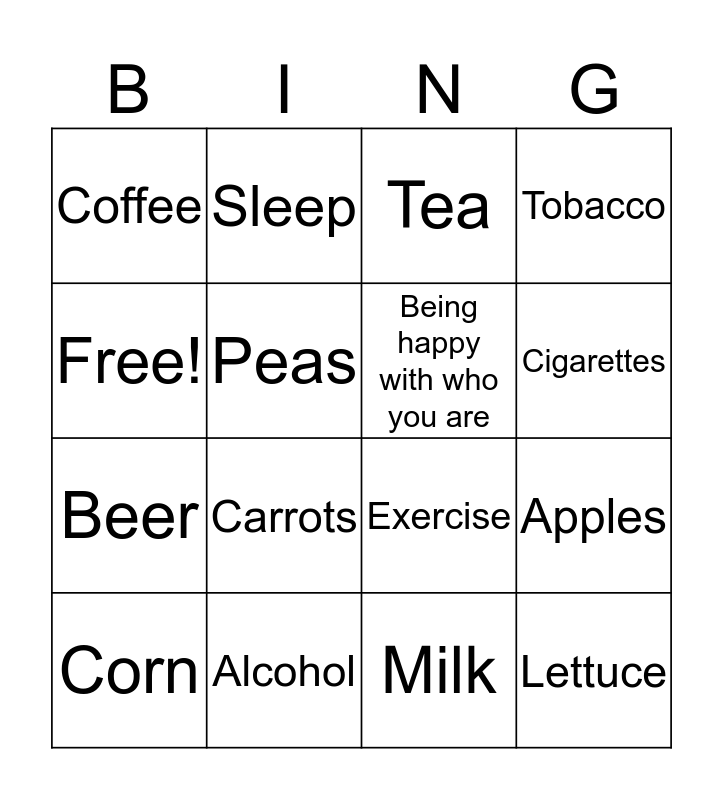 This bingo card has 16 words: Alcohol, Apples, Tea, Coffee, Beer, Sleep, Exercise, Milk, Free!, Peas, Corn, Tobacco, Carrots, Cigarettes, Being happy with who you are and Lettuce.