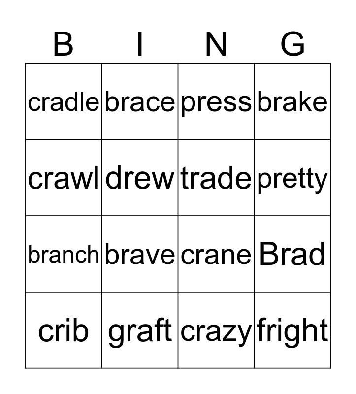 This bingo card has 72 words: Free!, brace, Brad, braid, brain, braise, brake, bran, branch, brand, brass, brat, brave, cradle, craft, crane, crash, crawl, crayon, crazy, creek, crib, cricket, cried, croak, crook, crop, drab, draft, drag, dragon, drain, drake, drank, drape, draw, dream, dress, drew, drift, drill, drink, fresh, Friday, friend, fright, frill, fringe, frizz, frog, grab, grace, grade, graft, grain, gram, press, pretty, pretzel, price, pride, prince, princess, grand, trace, track, trade, trail, train, tramp, trap and trash.