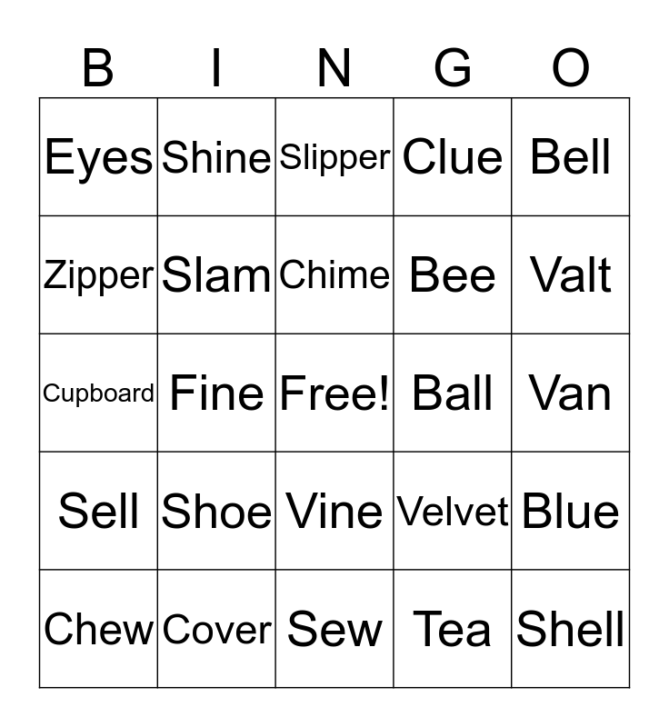 This bingo card has a free space and 29 words: Chew, Ice, Fine, Band, Eyes, Slipper, Slam, Shoe, Ball, Cover, Van, Shell, Sew, Tea, Valt, Exam, Vine, Sell, Bell, Cupboard, Velvet, Choose, Bee, Zipper, Clue, Shine, Blue, Chime and Crime.