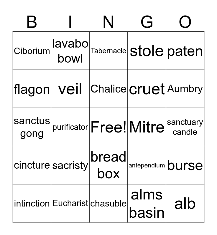 This bingo card has a free space and 24 words: sacristy, Eucharist, Chalice, intinction, paten, Ciborium, flagon, lavabo bowl, Mitre, bread box, cruet, sanctus gong, antependium, burse, veil, alms basin, sanctuary candle, Tabernacle, Aumbry, purificator, alb, cincture, stole and chasuble.