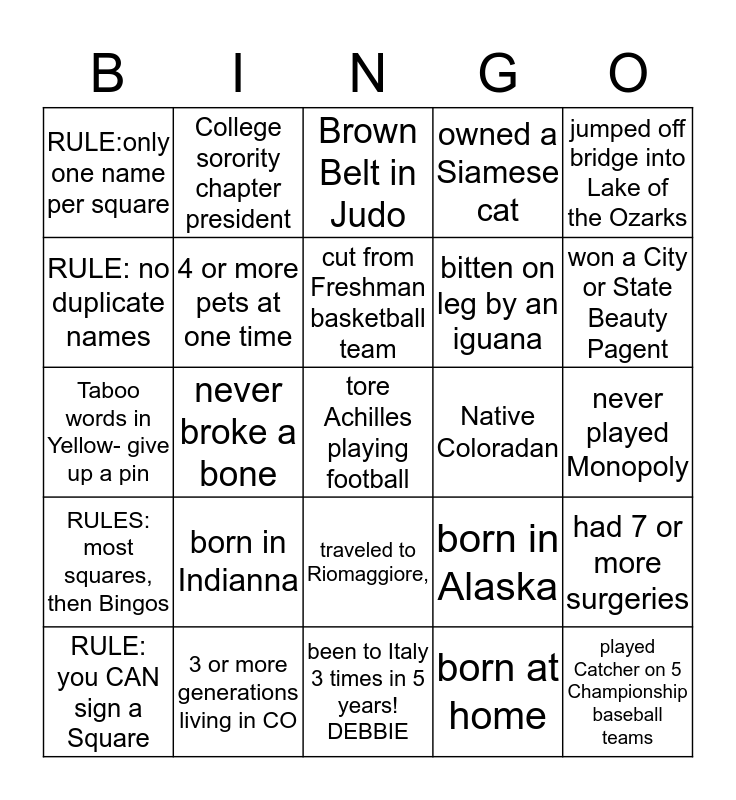 This bingo card has 25 words: RULES: most squares, then Bingos, 3 or more generations living in CO, tore Achilles playing football, born at home, jumped off bridge into Lake of the Ozarks, RULE:only one name per square, College sorority chapter president, Brown Belt in Judo, Native Coloradan, had 7 or more surgeries, RULE: no duplicate names, 4 or more pets at one time, been to Italy 3 times in 5 years! DEBBIE, born in Alaska, won a City or State Beauty Pagent, RULE: you CAN sign a Square, never broke a bone, cut from Freshman basketball team, bitten on leg by an iguana, never played Monopoly, Taboo words in Yellow- give up a pin, born in Indianna, traveled to Riomaggiore,, owned a Siamese cat and played Catcher on 5 Championship baseball teams.