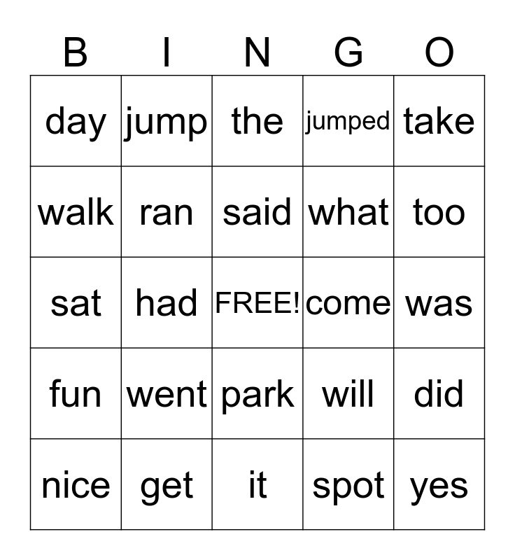 This bingo card has a free space and 24 words: went, get, said, nice, take, day, walk, jump, come, park, what, sat, will, did, ran, spot, was, the, too, had, yes, fun, jumped and it.
