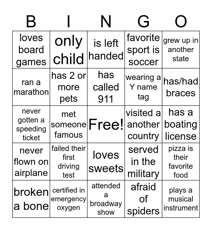 This bingo card has a free space and 29 words: broken a bone, has fainted in public, met someone famous, has grandkids, loves board games, is left handed, has 2 or more pets, failed their first driving test, visited a another country, certified in emergency oxygen, has a boating license, plays a musical instrument, attended a broadway show, afraid of spiders, has/had braces, has gotten stitches, loves sweets, never flown on airplane, grew up in another state, never gotten a speeding ticket, served in the military, met a new member this week, wearing a Y name tag, ran a marathon, favorite sport is soccer, only child, pizza is their favorite food, has called 911 and loves the YMCA.