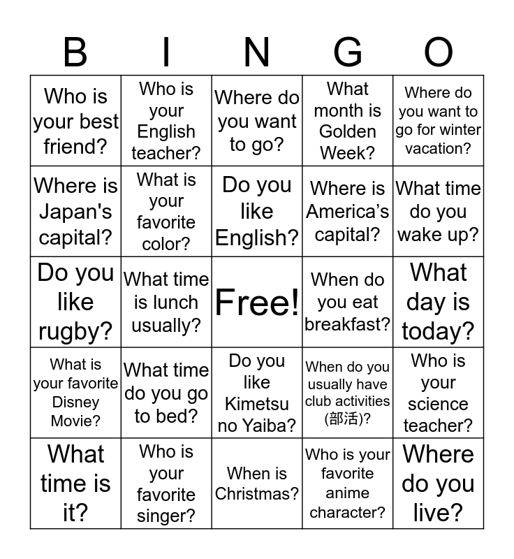 This bingo card has 3 images, a free space and 29 words: What time is it?, Where do you go to school?, What time is lunch usually?, When is your birthday?, Who is your best friend?, Where do you want to go?, What is your favorite color?, What time do you go to bed?, When do you eat breakfast?, Who is your favorite singer?, What day is today?, Where do you live?, When is Christmas?, Who is your favorite anime character?, What time do you wake up?, Does Mr. Ade like sports?, Do you like Kimetsu no Yaiba?, What is your favorite Disney Movie?, Where do you want to go for winter vacation?, Do you like rugby?, When do you usually have club activities (部活)?, Where do you go to school?, Where is America’s capital?, Where is Japan's capital?, What month is Golden Week?, Who is your English teacher?, Who is your science teacher?, Do you like English? and What time do you go home?.
