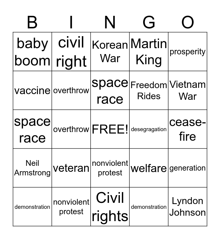 This bingo card has a free space and 24 words: veteran, nonviolent protest, space race, demonstration, prosperity, baby boom, vaccine, civil right, desegragation, nonviolent protest, Freedom Rides, space race, welfare, generation, overthrow, demonstration, cease-fire, Korean War, Vietnam War, overthrow, Lyndon Johnson, Neil Armstrong, Martin King and Civil rights.
