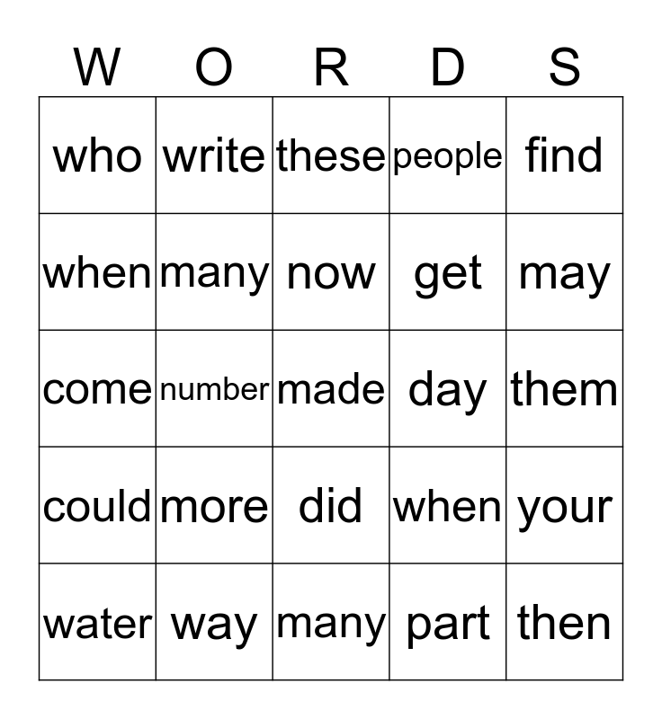 This bingo card has 25 words: more, many, now, water, find, who, when, write, day, did, get, come, when, your, many, then, them, these, may, number, made, way, could, people and part.