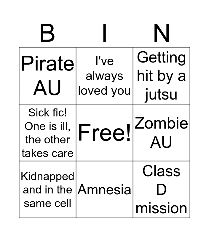 This bingo card has a free space and 49 words: Fairytale AU, Wartime, Friends to lovers, Hurt/Comfort, ABO, Domestic Fluff, I've always loved you, Werewolf!Iruka, Zombie AU, Drugged!Iruka, Kidnapped and in the same cell, Sick fic! One is ill, the other takes care, Things You Said When You Were Drunk, 2nd Chances: someone screwed up, But you promised, Legend, Amnesia, Why do you hate me?, Animals/pets, Class D mission, Ramen, Allergies, Pirate AU, Fantasy AU, Role Reversal (Hokage Iruka, Headmaster Kakashi), Everyone thinks they're dating, Royalty AU, Groundhog Day, Dystopian AU, Evil Twin, Pirate AU, Accidental Confession, You’re my idiot, Love at first rescue, Supernatural creature, Soulmates, Priest & Demon / Cultist & Angel, Fake dating, High school AU, Bodyguard / Celebrity, Love letters, Onsen, Celebrating an anniversary, Movie making, First meal together, Getting hit by a jutsu, Hunternin!Iruka, Having to work together and Dad!Iruka and kid!Naruto.