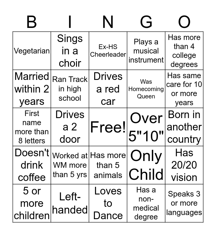 This bingo card has a free space and 29 words: 5 or more children, Drives a pick up truck, Drives a 2 door, Lived in 4 or more states, Vegetarian, Ex-HS Cheerleader, Ran Track in high school, Worked at WM more than 5 yrs, Over 5"10", Left-handed, Born in another country, Speaks 3 or more languages, Loves to Dance, Has a non-medical degree, Has same care for 10 or more years, Ran a marathon, Has more than 5 animals, Doesn't drink coffee, Has more than 4 college degrees, First name more than 8 letters, Only Child, Has a food allergy, Was Homecoming Queen, Married within 2 years, Plays a musical instrument, Sings in a choir, Has 20/20 vision, Drives a red car and Loves her job.