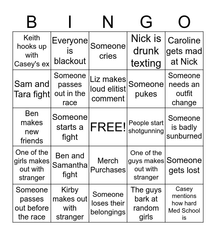 This bingo card has a free space and 24 words: Ben and Samantha fight, Kirby makes out with stranger, Liz makes loud elitist comment, Someone passes out before the race, Caroline gets mad at Nick, Keith hooks up with Casey's ex, Sam and Tara fight, Everyone is blackout, People start shotgunning, Merch Purchases, Someone pukes, Ben makes new friends, One of the guys makes out with stranger, Someone gets lost, Someone passes out in the race, The guys bark at random girls, Someone is badly sunburned, Someone cries, Someone needs an outfit change, Someone starts a fight, Casey mentions how hard Med School is, One of the girls makes out with stranger, Nick is drunk texting and Someone loses their belongings.