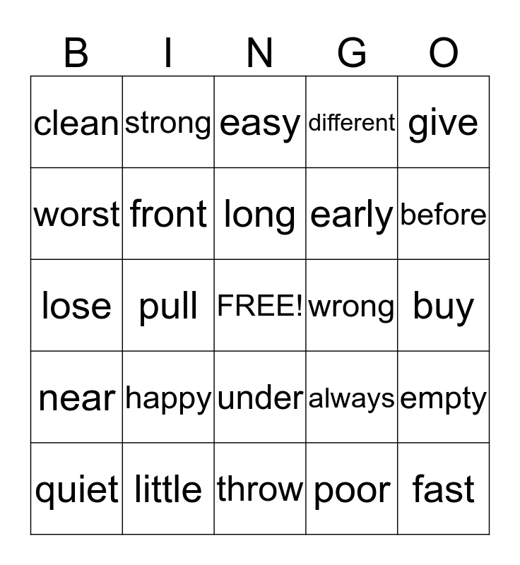This bingo card has a free space and 24 words: happy, little, long, quiet, give, clean, worst, strong, wrong, under, early, lose, always, empty, front, poor, buy, easy, before, pull, fast, near, different and throw.