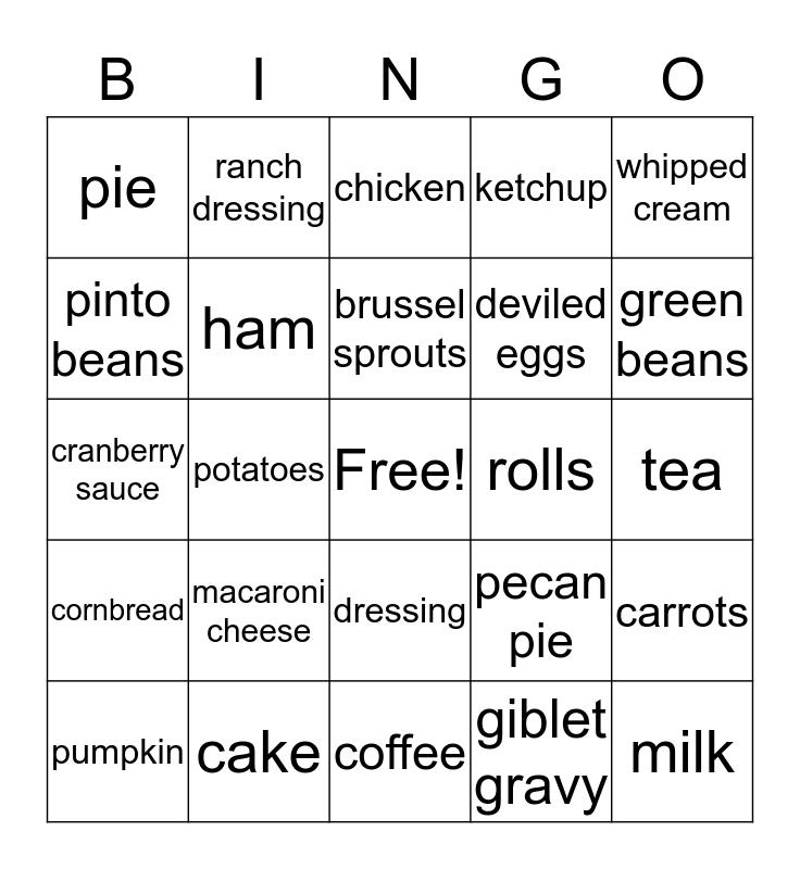 This bingo card has a free space and 29 words: pumpkin, turkey, potatoes, gravy, pie, chicken, ham, macaroni cheese, rolls, cake, tea, milk, coffee, giblet gravy, green beans, peas, dressing, cornbread, whipped cream, cranberry sauce, pecan pie, chocolate pudding, deviled eggs, pinto beans, ketchup, ranch dressing, carrots, brussel sprouts and celery.