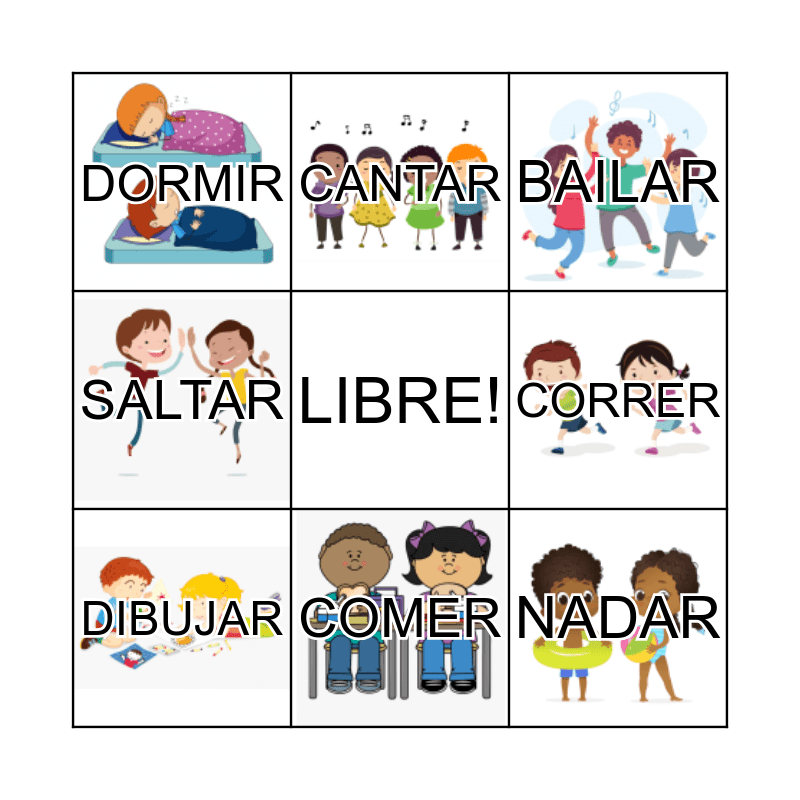 This bingo card has 8 images, a free space and 8 words: CORRER, BAILAR, CANTAR, DIBUJAR, DORMIR, NADAR, SALTAR and COMER.
