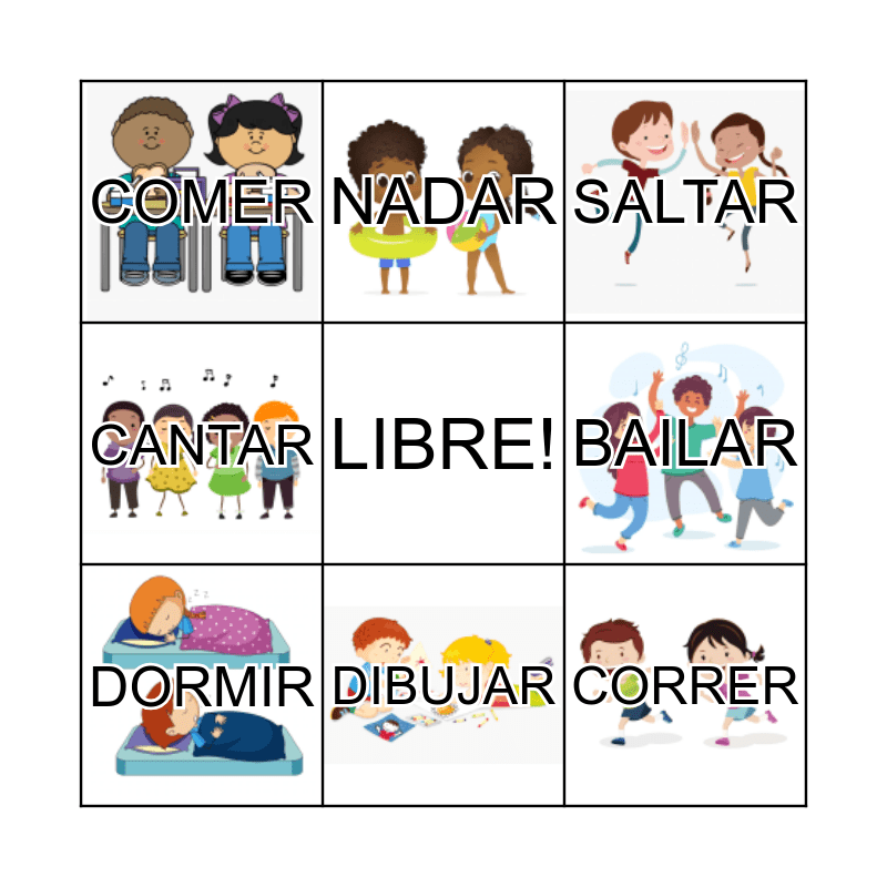 This bingo card has 8 images, a free space and 8 words: BAILAR, SALTAR, NADAR, DORMIR, COMER, CORRER, CANTAR and DIBUJAR.