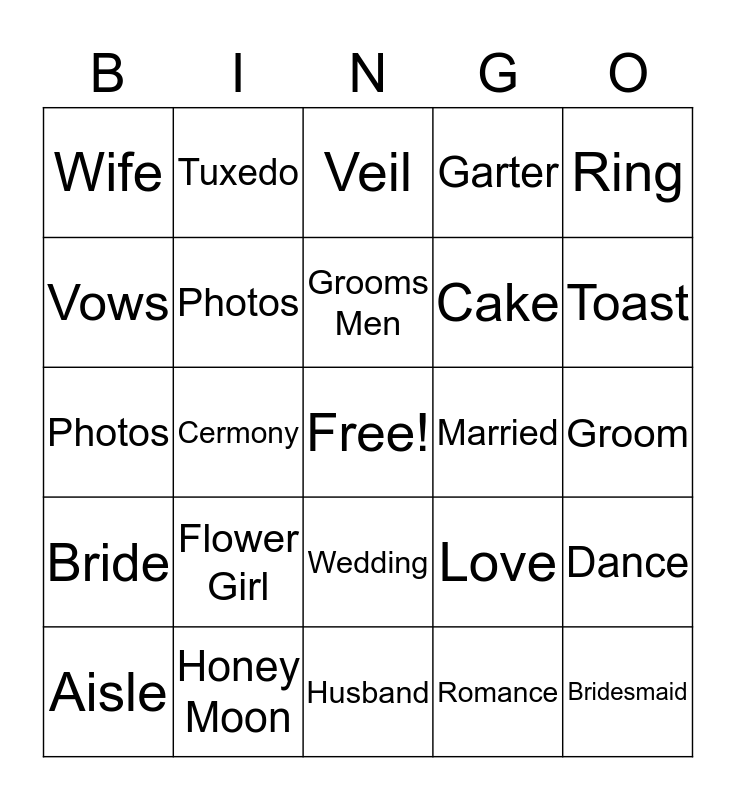 This bingo card has a free space and 29 words: Aisle, Garter, Cermony, Ring Bearer, Wife, Veil, Photos, Flower Girl, Married, Honey Moon, Groom, Bridesmaid, Husband, Romance, Toast, Alter, Wedding, Bride, Ring, Photos, Love, Dress, Cake, Vows, Garter, Tuxedo, Dance, Grooms Men and Bouquet.