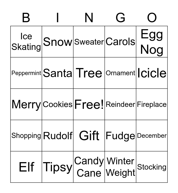 This bingo card has a free space and 39 words: Jingle Bells, Snowman, Sled, Santa, Elf, Gift, Tree, Mistletoe, Egg Nog, Shopping, Cookies, Carols, Stocking, Fireplace, Reindeer, Rudolf, Frosty, Ice Skating, Chestnuts, Fudge, Peppermint, Candy Cane, Ornament, Icicle, Ginger Bread House, Debt, Family, Turkey, Pumpkin Pie, Snow, Cards, Angel, Sweater, Tipsy, Winter Weight, Toys, December, Merry and Happy.