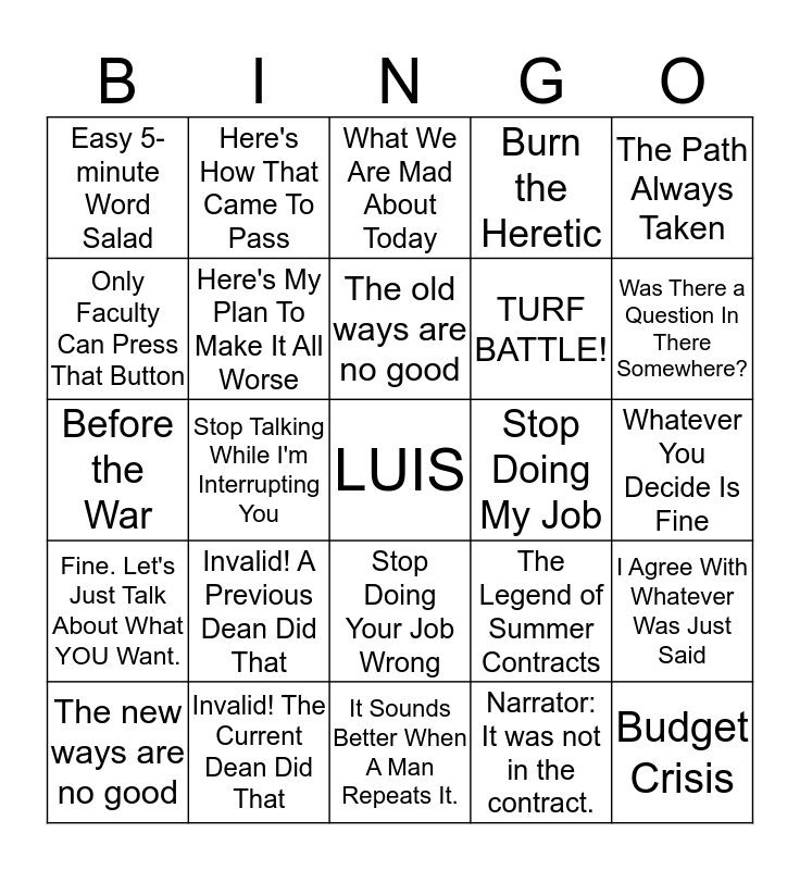 This bingo card has a free space and 24 words: Invalid! A Previous Dean Did That, Invalid! The Current Dean Did That, The old ways are no good, The new ways are no good, The Path Always Taken, Easy 5-minute Word Salad, Only Faculty Can Press That Button, Here's How That Came To Pass, Stop Doing My Job, Stop Doing Your Job Wrong, TURF BATTLE!, Before the War, The Legend of Summer Contracts, I Agree With Whatever Was Just Said, Here's My Plan To Make It All Worse, Narrator: It was not in the contract., Whatever You Decide Is Fine, What We Are Mad About Today, Was There a Question In There Somewhere?, Stop Talking While I'm Interrupting You, Budget Crisis, Fine. Let's Just Talk About What YOU Want., Burn the Heretic and It Sounds Better When A Man Repeats It..