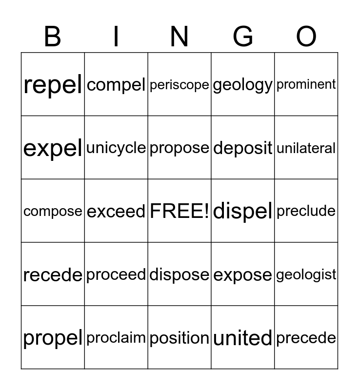 This bingo card has a free space and 24 words: proceed, proclaim, propose, propel, prominent, repel, expel, compel, dispel, dispose, deposit, compose, expose, geologist, unicycle, united, preclude, periscope, unilateral, exceed, precede, recede, geology and position.