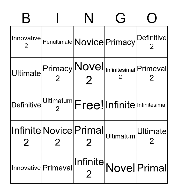 This bingo card has a free space and 24 words: Novice 2, Primeval, Novel 2, Innovative, Definitive 2, Innovative 2, Ultimate, Penultimate, Infinite, Primal 2, Infinitesimal 2, Definitive, Ultimatum, Ultimate 2, Primacy 2, Novel, Infinitesimal, Novice, Primeval 2, Ultimatum 2, Primal, Infinite 2, Primacy and Infinite 2.