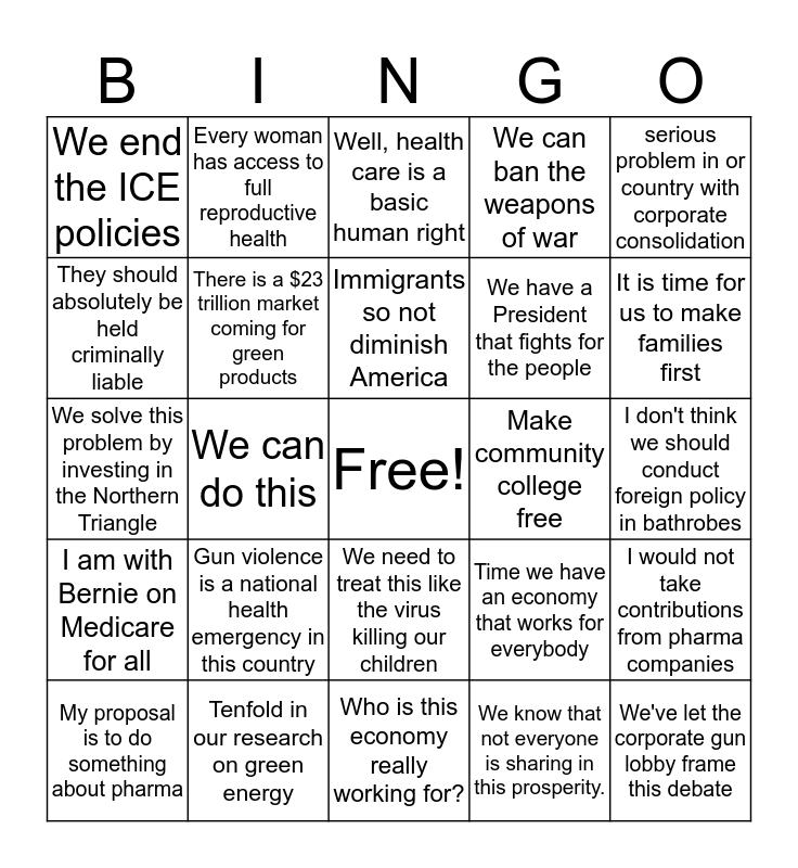 This bingo card has a free space and 25 words: I am with Bernie on Medicare for all, Tenfold in our research on green energy, Who is this economy really working for?, We know that not everyone is sharing in this prosperity., serious problem in or country with corporate consolidation, We end the ICE policies, Every woman has access to full reproductive health, Well, health care is a basic human right, Make community college free, I would not take contributions from pharma companies, They should absolutely be held criminally liable, There is a $23 trillion market coming for green products, Health care should be a American right., Time we have an economy that works for everybody, It is time for us to make families first, My proposal is to do something about pharma, We can do this, Immigrants so not diminish America, We have a President that fights for the people, I don't think we should conduct foreign policy in bathrobes, We solve this problem by investing in the Northern Triangle, Gun violence is a national health emergency in this country, We need to treat this like the virus killing our children, We can ban the weapons of war and We've let the corporate gun lobby frame this debate.