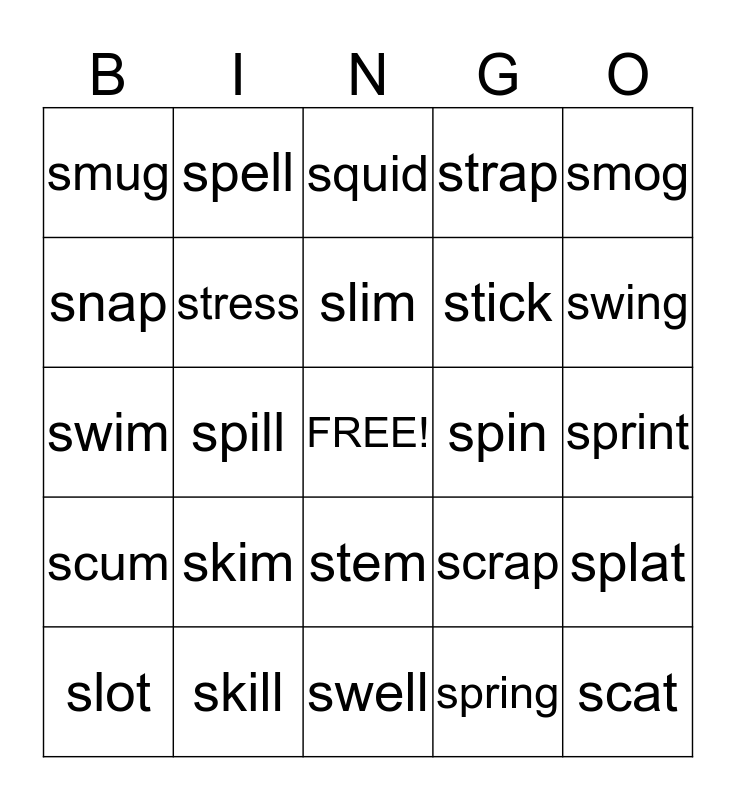This bingo card has a free space and 24 words: skim, skill, slim, slot, smog, smug, snap, spell, spin, stem, stick, swim, scrap, splat, stress, spring, sprint, squid, swing, spill, scat, scum, strap and swell.