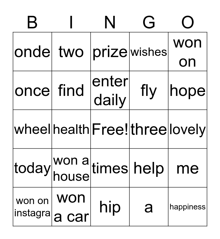 This bingo card has a free space and 24 words: won a house, won a car, enter daily, won on instagra, won on, onde, once, two, three, times, fly, wheel, help, me, find, a, lovely, prize, hope, health, happiness, today, wishes and hip.
