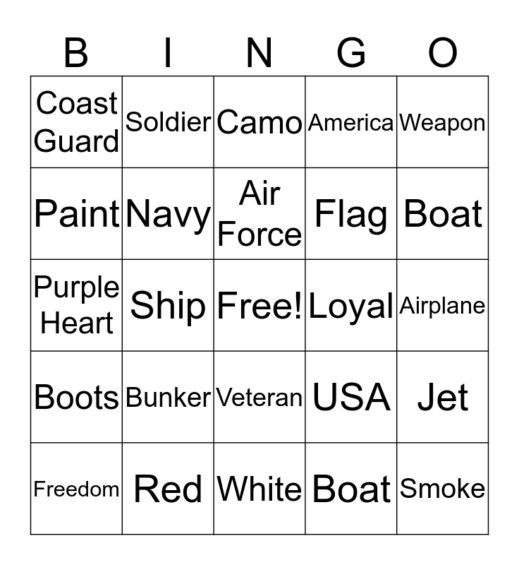 This bingo card has a free space and 29 words: Freedom, Army, Ship, Marines, Coast Guard, Camo, Navy, Bunker, Loyal, Red, Airplane, Smoke, White, Boat, Boat, Green, Veteran, Boots, Weapon, Purple Heart, USA, War, Flag, Paint, America, Soldier, Jet, Air Force and Blue.