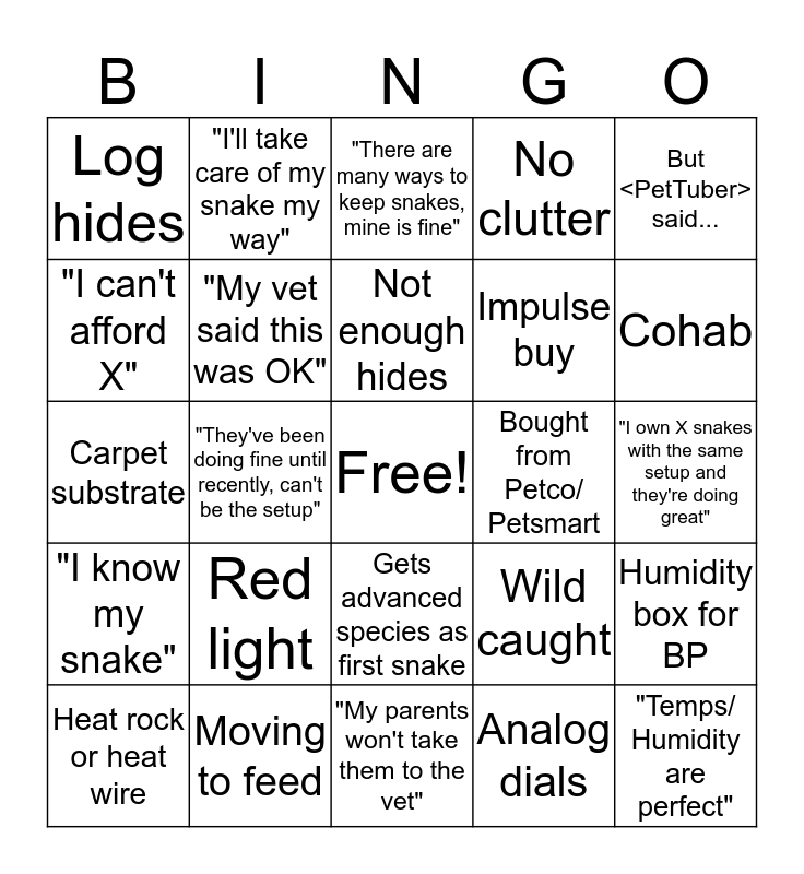 This bingo card has a free space and 27 words: Wild caught, Doesn't know species, Impulse buy, "My parents won't take them to the vet", "I can't afford X", "There are many ways to keep snakes, mine is fine", "I'll take care of my snake my way", "I know my snake", Bought from Petco/ Petsmart, Humidity box for BP, Carpet substrate, No clutter, Heat rock or heat wire, Moving to feed, Cohab, No thermostat, "My vet said this was OK", Not enough hides, Red light, Log hides, "I own X snakes with the same setup and they're doing great", Analog dials, "They've been doing fine until recently, can't be the setup", "Temps/ Humidity are perfect", Gets advanced species as first snake, But <PetTuber> said... and Breeding season/ Brumation.