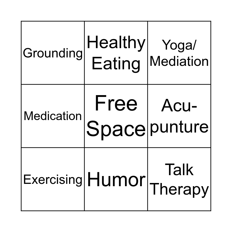 This bingo card has a free space and 15 words: Positive Thinking, Mental Reframing, Yoga/ Mediation, Grounding, Humor, Talk Therapy, Deep Breathing, Relaxation, Acu-punture, Emotional Awareness, Family/ Friend Support, Medication, Exercising, Healthy Eating and Sleep.