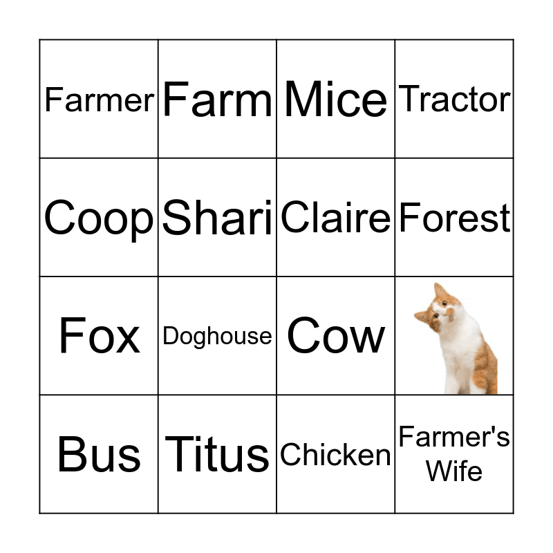 This bingo card has 1 images and 15 words: Titus, Mice, Farmer, Fox, Farm, Cow, Chicken, Coop, Shari, Bus, Tractor, Doghouse, Forest, Claire and Farmer's Wife.