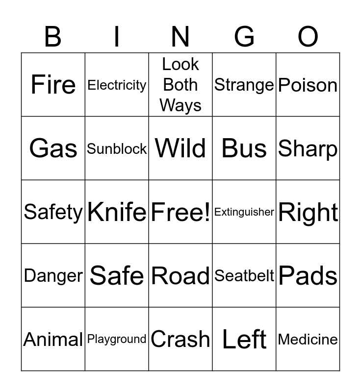 This bingo card has a free space and 24 words: Safe, Playground, Wild, Animal, Poison, Fire, Gas, Electricity, Extinguisher, Road, Bus, Safety, Seatbelt, Pads, Sunblock, Left, Right, Look Both Ways, Sharp, Knife, Medicine, Danger, Strange and Crash.
