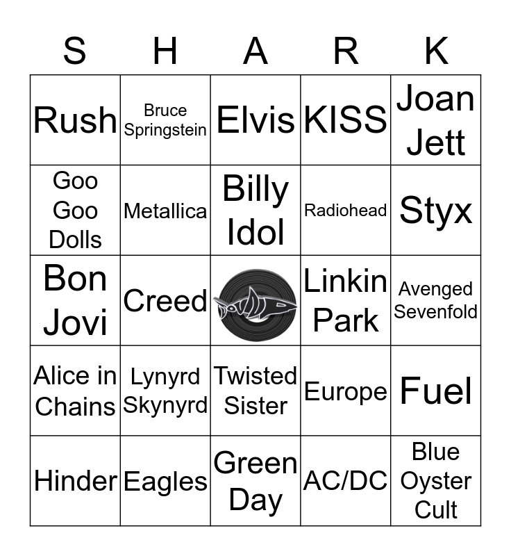 This bingo card has a free space and 44 words: Queen, Lynyrd Skynyrd, Guns N Roses, AC/DC, Black Sabbath, Thin Lizzy, Metallica, Led Zeppelin, KISS, Blue Oyster Cult, Rush, Eagles, Europe, Avenged Sevenfold, Disturbed, 3 Doors Down, Green Day, Linkin Park, Evanescence, Bon Jovi, Bruce Springstein, Twisted Sister, Ozzy Osbourne, Joan Jett, Alice Cooper, Korn, Billy Idol, Def Leppard, Fuel, Hinder, Doors, Elvis, Stone Temple Pilots, No Doubt, Alice in Chains, Scorpions, INXS, Three Days Grace, Styx, Goo Goo Dolls, Creed, Matchbox 20, Radiohead and Tom Petty.