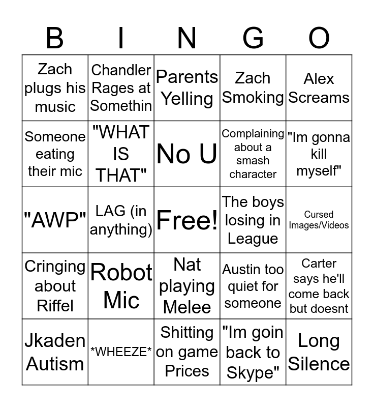This bingo card has a free space and 24 words: Robot Mic, *WHEEZE*, No U, Jkaden Autism, Alex Screams, Zach plugs his music, Someone eating their mic, Chandler Rages at Somethin, The boys losing in League, Nat playing Melee, Complaining about a smash character, "AWP", Austin too quiet for someone, Carter says he'll come back but doesnt, "WHAT IS THAT", "Im goin back to Skype", Cursed Images/Videos, Parents Yelling, "Im gonna kill myself", LAG (in anything), Long Silence, Cringing about Riffel, Zach Smoking and Shitting on game Prices.