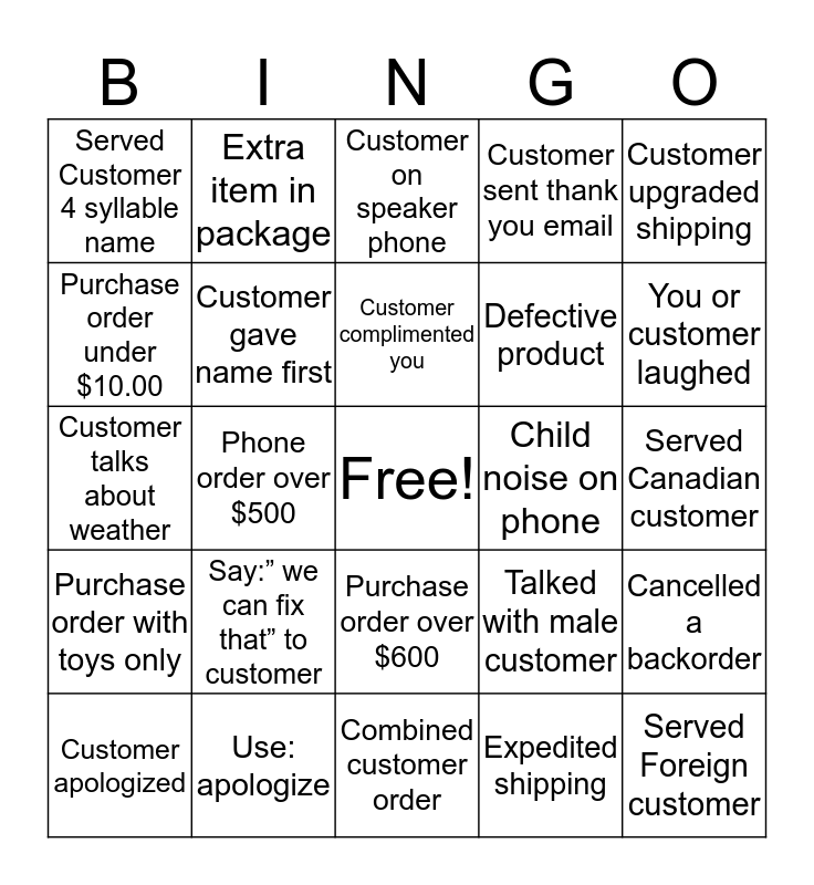 This bingo card has a free space and 39 words: First-time customer, Phone order over $300, Customer said Merry Christmas, Customer gave name first, Customer apologized, Purchase order over $600, Customer complimented you, Customer compared us to competitor, Customer upgraded shipping, Purchase order with toys only, Phone order over $500, Customer sent thank you email, Served Foreign customer, Served Canadian customer, Child noise on phone, Say:” we can fix that” to customer, Customer mentions animals, Served Customer 4 syllable name, Served Customer named Jennifer, Talked with male customer, Purchase order under $10.00, Combined customer order, Defective product, You or customer laughed, Served Customer with Bible name, Heard or used: “outside the box”, Customer mentions Snow, Customer asks for you, Damaged package, Extra item in package, Customer talks about catalog, Mentions discount or coupon code, Customer on speaker phone, Use: apologize, Expedited shipping, Lost package, Cancelled a backorder, Customer talks about weather and Heard music.